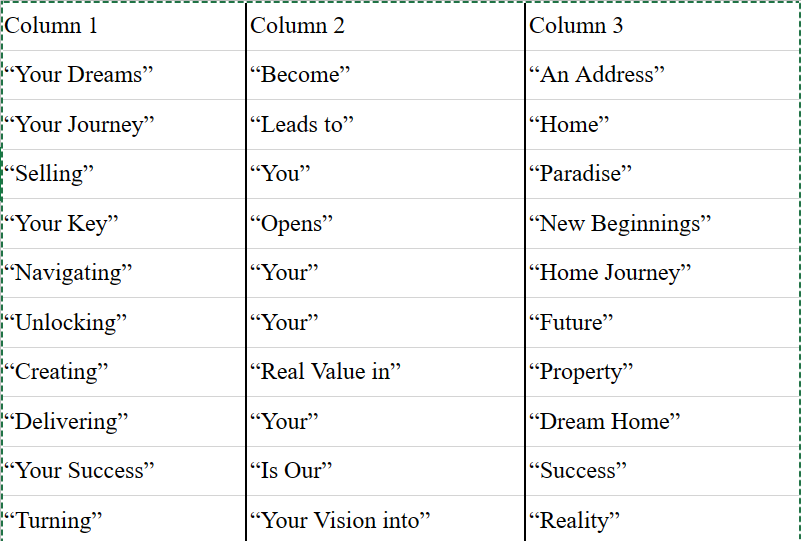 Here’s a simple table that can act as a real estate slogan generator. You can mix and match phrases from each column to create a unique slogan: